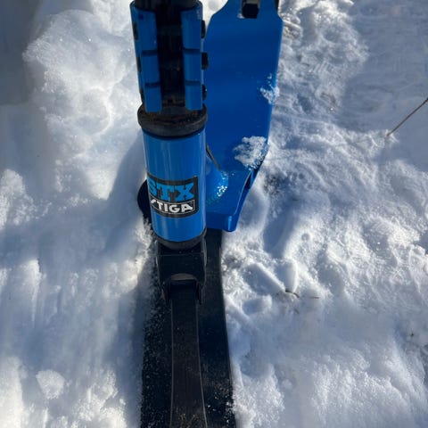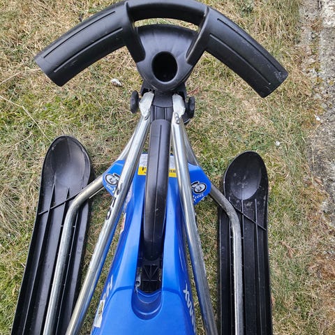 Hamax akebrett i blå farge. Klassisk rattkjelke med tre ski og metallramme. Utstyrt med ratt foran og bremsesystem.