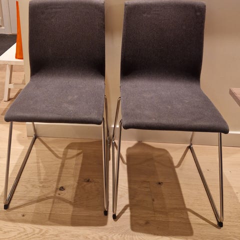 Er krommede meieben, med en fin blåfarge. . Komfortable og stabile stoler. Normal bruksslitasje i stoff/små flekker, men hele og fullt funksjonelle.