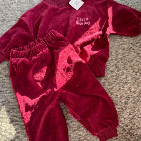 Sett i rød farge,med velourpreg, består av genser med lange ermer og volangdetaljer på skuldrene, samt matchende kort bukse med strikk i livet. Genseren har tekst og motiv foran. Egnet som hverdags- eller koseantrekk for barn.