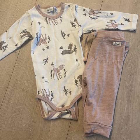 Name it body og leggings i ull til jente i størrelse 86-92. Sett med langermet body i brun flerfarget tone med dyremotiv på brystet og matchende flerfargede leggings med natur- og dyreinspirert mønster. Materiale i ull gir et mykt og behagelig plagg som egner seg godt som innerlag eller koseklær til hverdagsbruk. Lite bruks hull i sømmen bak på buksen. Se bilde