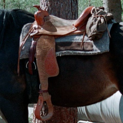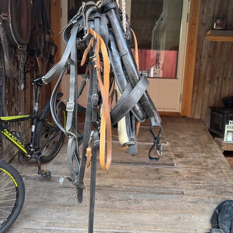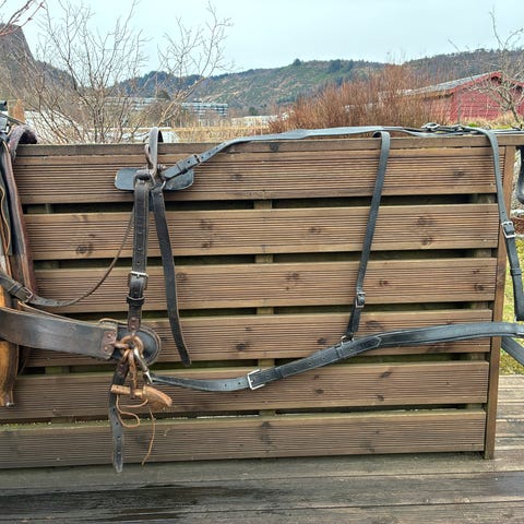 Arbeidssele, komplett med reimer. Usikker på størrelsen, men utfra lengde på reimer antas den å passe fra fjording til døl.