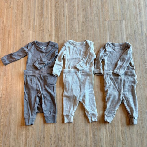 En fin minipakke til nyfødt baby. Babysett med langermet body str. 50 (passet også til baby i lende 56), bukse med høy ribbekant i livet str 56, lue med øre-detaljer i str. 40/42 og sokker.