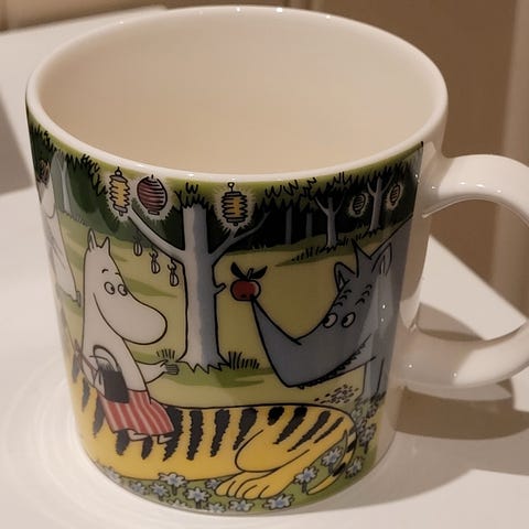 Ny og ubrukt mummikopp fra Moomin Arabia, sommersesongen 2023 av typen "Hagefest" / "Garden Party". Utgått utgave.