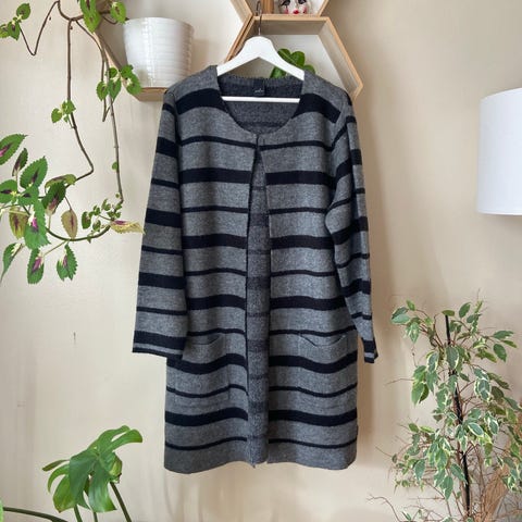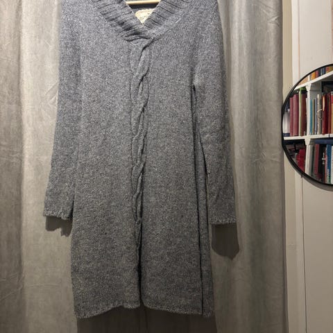 Monsoon cardigan for dame i størrelse S. Cardiganen er flerfarget med mørke nyanser og har en lengre passform. Plagget er strikket i akrylblanding som gir et mykt og lett uttrykk. Egner seg godt som et lag over topp eller kjole til hverdagsbruk.
