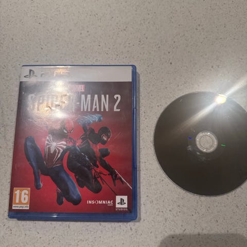 PlayStation Marvel’s Spider-Man 2 spill til PlayStation 5. Fysisk utgave på disk i standard PS5-blå plastboks.