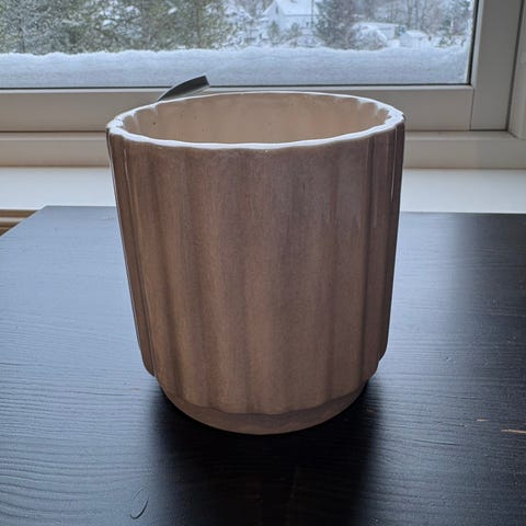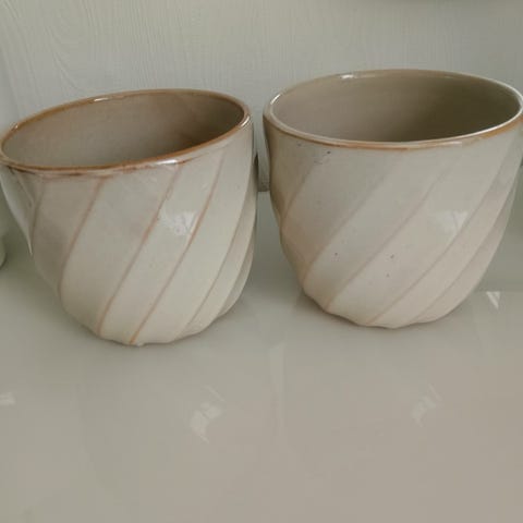 To stk. potte skjulere fra mester grønn i beige med rillet overflate. Høyde ca. 12,5 cm og diameter ca. 12 cm, egnet som potteskjuler til mindre planter. Glassert inn- og utside. Kan plasseres på bord, hylle eller vinduskarm. Selges samlet. Må hentes