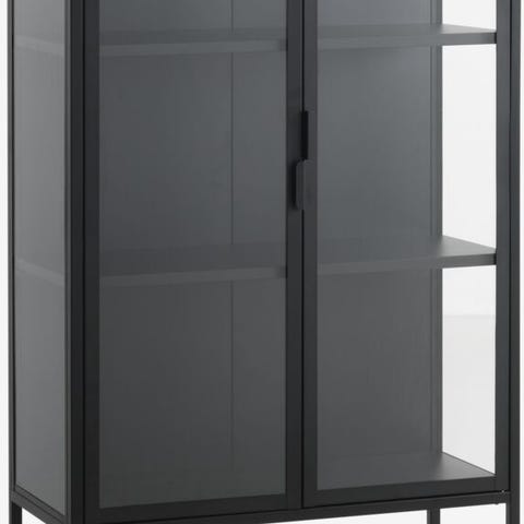 Jysk vitrineskap i metall med glassdører. Skapet har ramme i mørklakkert metall og sider samt fronter i glass. Innvendig er det flere hyller som gir god plass til oppbevaring og utstilling av gjenstander. Passer til bruk i stue, spisestue eller andre rom der man ønsker synlig oppbevaring bak glassdører. Må hentes.