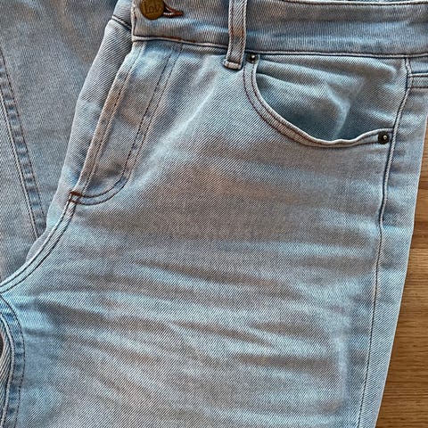 Selger en ubrukt Samsøe Samsøe denim bukse i str medium. Kjempelys denim, med mørkeblå skygger, sommer modell, rett i bena, stretch i stoffet.