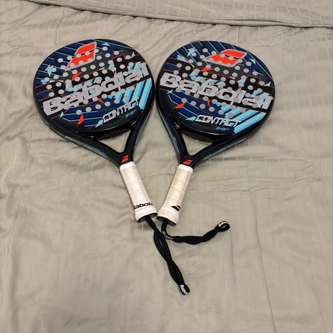 Sort og blå: Babolat Air Vertuo er en padelracket til offensive spillere som ønsker en lett og manøvrerbar racket med god kraft. Air Vertuo har glassfiberoverflate, karbonramme og EVA-skumkjerne. Denne kombinasjonen gir en lett og semi-myk racket som er perfekt til noe erfarne padelspillere. (Hentet fra nettet).