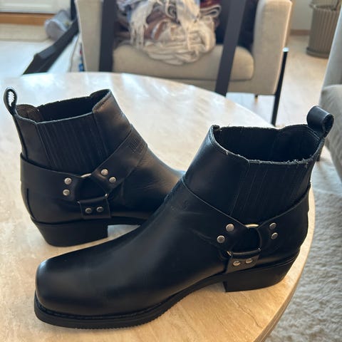H&M støvler i størrelse 37. Støvlene er svarte med ankelhøy skaft og dekorative remmer med metallspenner og ringer rundt ankelen. De har hemper bak for enklere av- og påkledning og elastiske felt i sidene for bedre passform. Sålen er flat med lav hæl. Passer til hverdagsbruk i kjøligere vær.