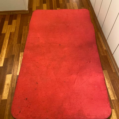 Noen merker etter vekter som har blitt liggende oppå matta, men det vil muligens jevne seg ut.