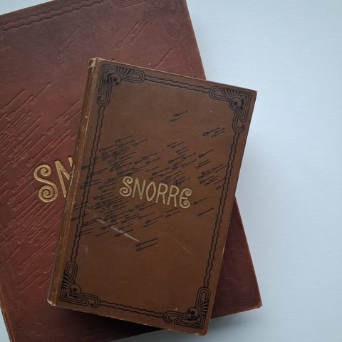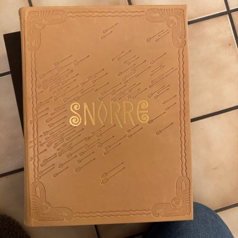 Snorre bok i brun innbinding. Boken har preget forside med tittelen «Snorre» i gullskrift. Inneholder tekst om Snorre Sturlassons liv og skrifter, med illustrasjoner. Egner seg som lesebok eller som del av en samling av klassisk litteratur og historiske verk.