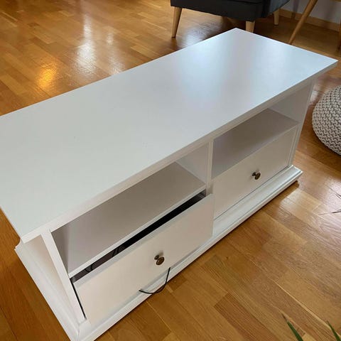 Gis bort. Flekk som vist på bilde - ikke forsøkt fjernet. Ene skuffen går ikke helt opp (men nok til å brukes som vanlig)