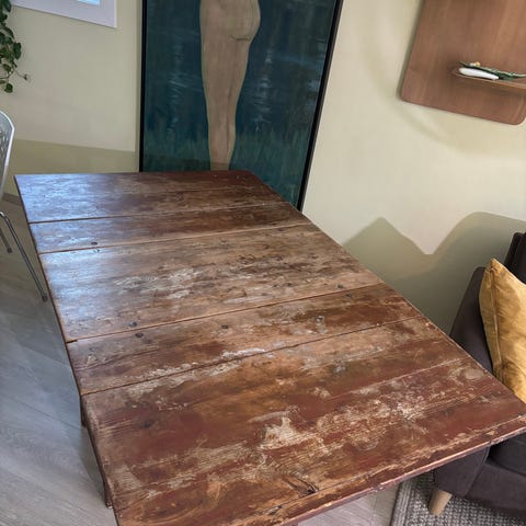 Gammelt bondebord i ubehandlet furu m/firkante trenagler