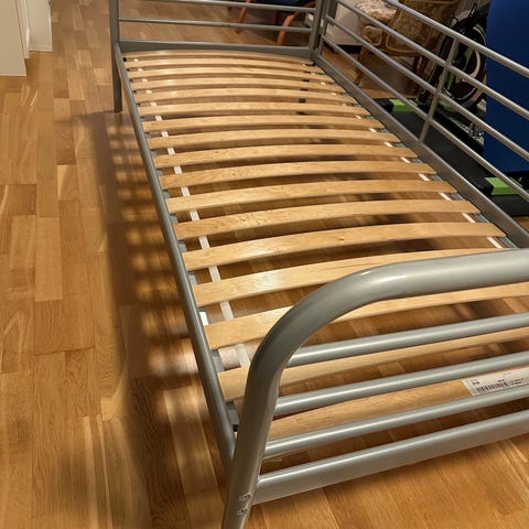 IKEA Sultan Stamnes seng i hvit utførelse. Sengen har polstret ramme og madrass med avtagbart trekk, ifølge vaskeanvisningen på etiketten. Nøytral farge som passer inn i de fleste soverom. Egnet som enkeltseng til soverom, gjesterom eller hybel. Metallben gir stabil støtte under sengen.