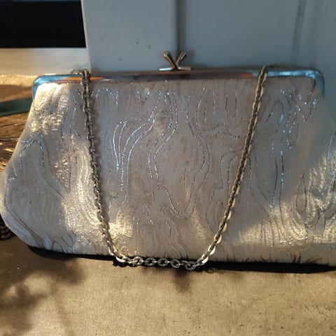 Vintage stoff veske for dame med metallramme og kjedestropp. Vesken har et mønstret tekstil i lyse toner med innslag av glitrende detaljer. Den lukkes med metallspenne øverst og har en gullfarget skulderreim i kjede. Passer som liten skulderveske eller clutch til anledninger der man trenger plass til det mest nødvendige.