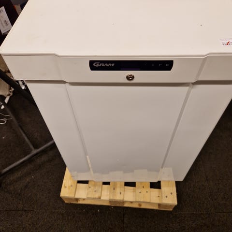 Fryseren virker godt, men mangler nederste skuff.Det er misfarging på håndtaket