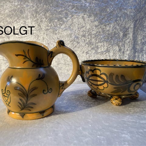 Sett med to keramikkmugger i gul farge med brun dekor. Den ene muggen har helletut og hank, den andre har rett hals uten tut. Begge har håndmalt mønster med blomster- og bladmotiv. Egner seg til servering av drikke eller som dekorative vaser. Produsent og nøyaktig modell er ikke spesifisert på bildene.