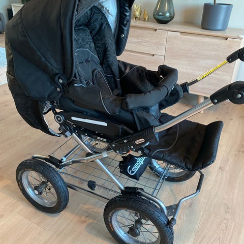 Emmaljunga barnevogn i lys/hvit farge. Vognen består av klassisk understell med store hjul og håndtak, liggedel med kalesje og matchende stelleveske. I tillegg følger det med en sitte-/sportsdel med justerbar rygg, fempunktssele og frontbøyle. Tekstilene er i ensfarget, lys tone. Vognen kan brukes både med liggedel til spedbarn og med sportsdel til større barn. Passer til hverdagsbruk og trilleturer på ulike underlag, avhengig av hvilket understell og hjultype modellen har.