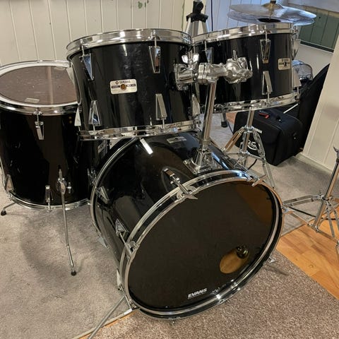 Settet består av basstromme, skarptromme, tammer og gulvtam, samt cymbaler og stativer slik som vist på bildene. Skinnene er godt brukt men her er det mye trommer for en billig penge. Må hentes