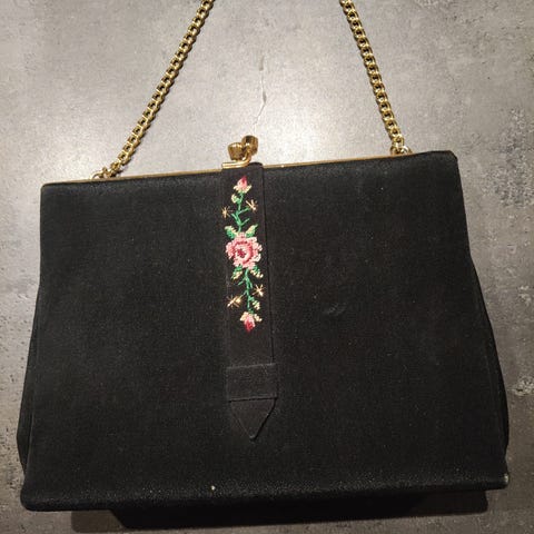 i stoff for dame. Vesken er svart og har metallramme øverst med klipslukking. Den har en dekorativ gullfarget lenke som kan brukes som skulderreim. På fremsiden er det en smal dekorstropp med brodert blomstermotiv i rosa og grønt. Passer til oppbevaring av mindre nødvendigheter som mobil, nøkler og lommebok ved bruk til hverdags eller enklere penere anledninger.