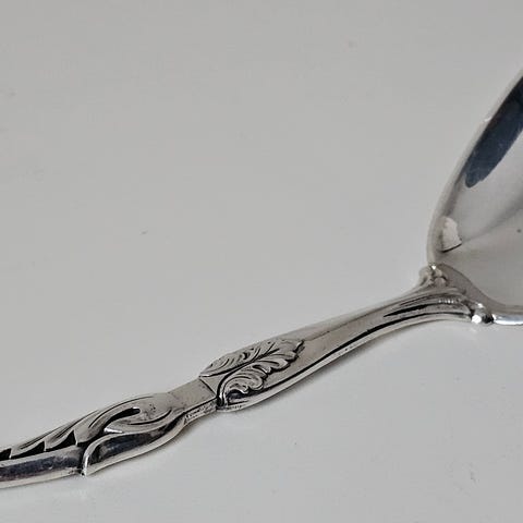 Festbordsølv syltetøyskje fra Sylvmsmidja på Voss. "J" for Johannessen, altså Leif Johannesen. Skje i helsesølv; 830S sølv.