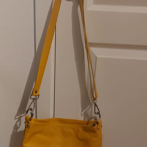 Carpisa skulderveske i kunstlær for dame. Vesken er gul og har en klaff med hullmønster og metallnagler i front. Justerbar skulderrem gjør at lengden kan tilpasses. Innvendig har vesken hovedrom, en glidelåslomme og en åpen stikklomme for mindre eiendeler. På baksiden er det en ekstra lomme. Egnet som liten hverdagsveske eller til å ha med det viktigste som mobil, nøkler og lommebok.