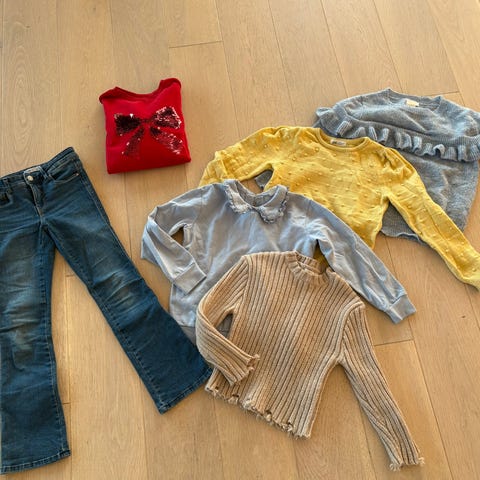 Stor og fin klespakke til jente str 134/140 med gode basics perfekt til skolen. Alt kan mikses og matches, og er pent og lite brukt av ett barn i et røyke- og dyrefritt hjem.