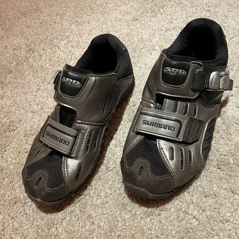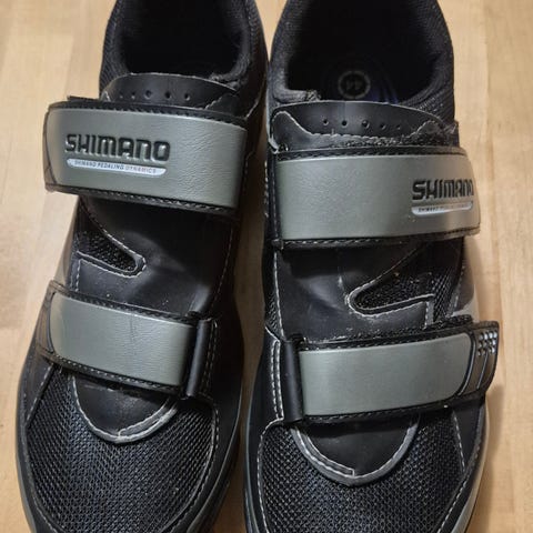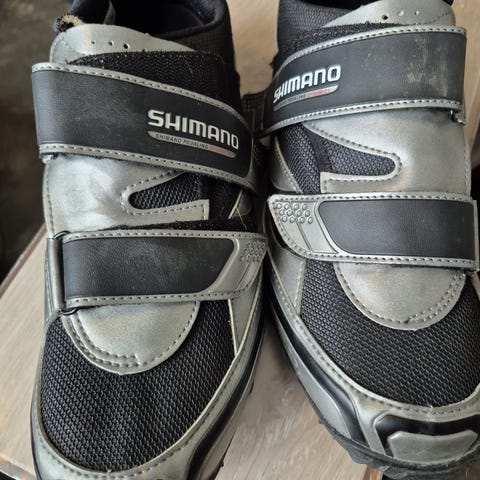 Shimano sykkelsko i størrelse 45. Skoene er svarte med borrelåslukking over vristen. Sålen har mønster og er tilpasset klikkpedaler med monterte klosser. Egnet til sykling der det brukes klikkpedaler, for eksempel terreng- eller tursykling.