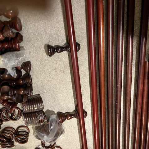 Venstre: 1 offwhite 155cm lang+2 endestykker 12cm lange+to holdere cm+12 ringer. Veil pris kr. 3560, selges for kr. 1700.