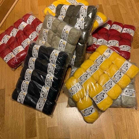 Black Friday garnpakke med flere nøster i blandede farger. Bildene viser blant annet gult, rødt, hvitt, grønt, blått og svart garn. Garnet er pakket i plastposer med flere nøster i hver pakke. Egnet til ulike strikke- og hekleprosjekter som plagg, tilbehør og interiørartikler. Nærmere informasjon om garntype, materiale, løpemeter og anbefalt pinnestørrelse fremgår av banderolene på nøstene der dette er oppgitt.