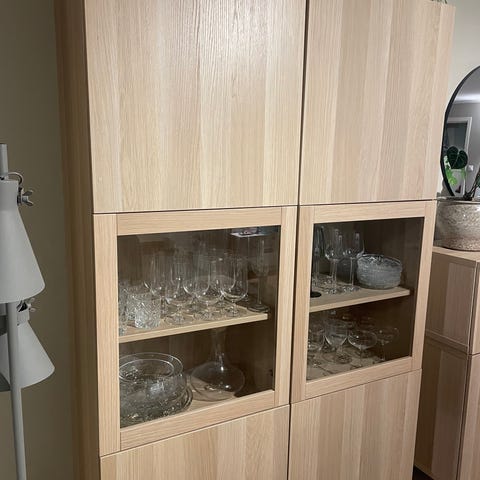 Oppå skjenken står to skap av type SM85, hvitoljet eik. 95 cm x 98 cm. Det er to flyttbare glasshyller i hver, se bilde. Hyllene tåler en god del vekt, for eksempel flere kakefat og skåler. Dørene har push-åpning. Det er to fungerende lys med timer i hvert skap.