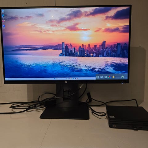 Stasjonær datamaskin fra Lenovo i kompakt kabinett. Bildene viser at den er koblet til skjerm og tastatur, samt tilkoblingsmuligheter på for- og baksiden med flere USB-porter og nettverksport. Egnet til generell kontorbruk, enkel hjemmebruk og nettlesing.