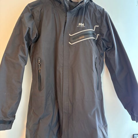 Lett regnjakke fra Helly Hansen. Selges da den er blitt for liten. Har fleeceforet hette. Jakken har også en funksjon slik at man kan pakke inn hetten inn i kragen.
