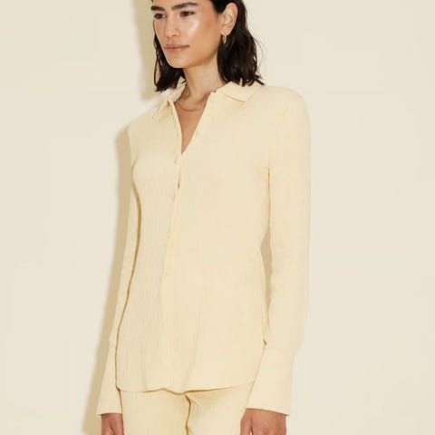 Nelly topp for dame i størrelse XS. Toppen er gul og laget i denim-materiale. Modellen har lange ermer, v-utringning og knappelukking foran. Passer til hverdagsbruk og kan kombineres med ulike underdeler som jeans eller skjørt.