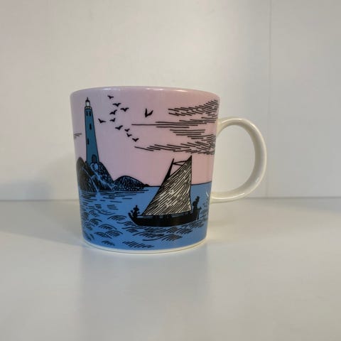 Arabia Mummi kopp i porselen med motiv av båt, hav og fugler på rosa og blå bakgrunn. Koppen har hank og trykk med Arabia-logo og 65-årsmerke under. Egner seg til varme og kalde drikker ved bruk i hverdagen eller som del av en Mummi-samling.