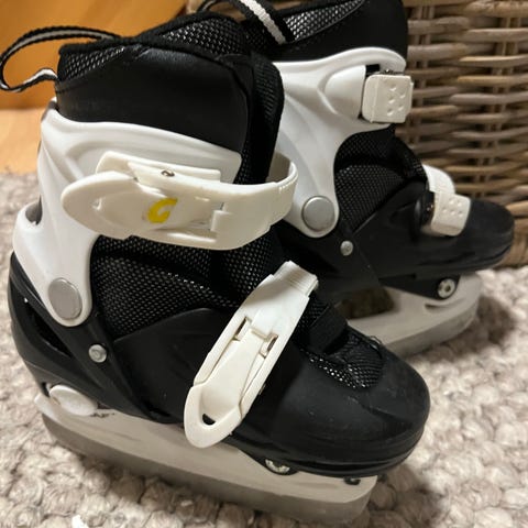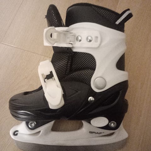Graf justerbare ishockeyskøyter for barn i størrelse 31. Skøytene er merket som justerbare fra størrelse 31–34, noe som gir mulighet for tilpasning etter fotlengde. Overdelen er i syntetisk materiale med hvite og lilla detaljer, samt polstret innside for økt komfort. Lukkes med kombinasjon av spenner og borrelås for enkel av- og påtaking. Egnet til ishockey og generell skøytebruk for barn på isbane eller skøyteis.