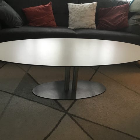 Plekter-formet sofabord. Hvit laminat bordplate med sorte sider og stabil senterfot i børstet rustfritt stål.