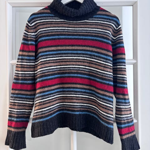 Strikket i Drops Flora ( tynn ull ). Lengde ca 57 cm, arm 45 cm.