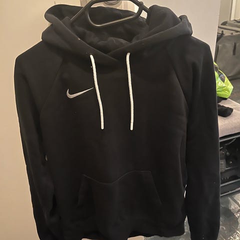 Nike hettegenser for herre i størrelse M. Genseren er grå med stor hvit Nike-logo på brystet. Modellen har hette med snøring og ribbekanter nederst og på ermene. Passer til hverdagsbruk og ulike typer fritidsaktiviteter.