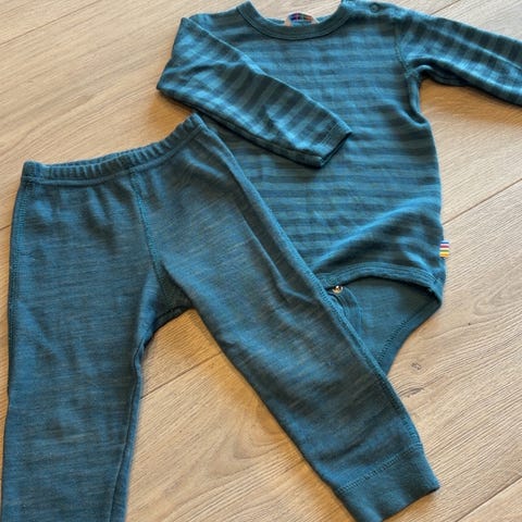 Joha ullsett for jente i størrelse 80. Sett med body og bukse i merinoull med bambus innside. Flerfarget mønster med lyserosa kanter. Egnet som innerlag eller nattøy. Lite brukt uten synlige merknader.