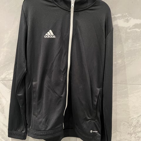 Adidas treningsdress for herre i størrelse M. Sett med jakke og bukse i grønn farge med hvite Adidas-striper langs ermene og bena. Jakken har hel glidelås foran og ståkrage. Buksen har smal passform og elastisk linning. Egnet til trening, fritid og annen fysisk aktivitet.