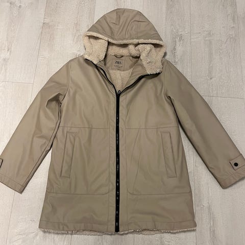 Regn Zara jakke for jente i størrelse 152. Jakken er beige. Den har hette og mykt, teddy-lignende fôr på innsiden. Yttermaterialet er glatt, med glidelås foran og lommer med klaff. Passer som ytterjakke til hverdagsbruk i kjøligere vær.
