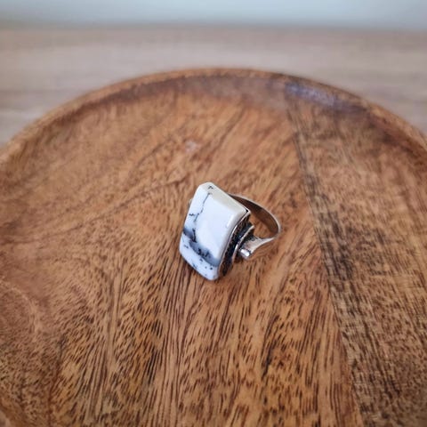 Selger en flott kunsthåndlaget ring i 925 sterlingsølv, stemplet JL 925. Ringen har en oval naturstein med vakkert, organisk mønster (trolig fossil korall eller lignende stein).