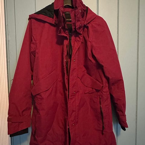 Didriksons ytterjakke for dame i brun farge, størrelse S. Jakken er laget i polyester og har lengre passform som dekker godt nedover lårene. Den har hette, frontlukking med glidelås og knappestolpe, samt flere frontlommer med klaff og justerbare detaljer. Ermene har ribbestrikkede mansjetter på innsiden for bedre komfort. Passer som annet yttertøy til hverdagsbruk og utendørsaktiviteter. 100% Waterproof . En jakke som tåler mye vind og . Jakken er romslig i størrelsen . Holder godt på varmen . Den ble litt for stor for meg så har kjøpt maken i xs . Helt super jakke å ha når det er kaldt eller regner