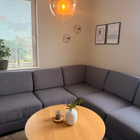 IKEA hjørnesofa i lys grå tekstil. Sofaen består av flere moduler som danner en romslig hjørneløsning med sjeselongdel. Trekket er i lys grå stoffkvalitet, og sofaen har løse sitte- og ryggputer. Sofaen står på lave ben på 40cm høyd og er egnet som hovedsofa i stue eller TV-rom, med god plass til flere personer å sitte eller ligge. også nettopp kjøpt nye trekk. trekkene er ny salger pga Flytting ny pris 9.740,-
