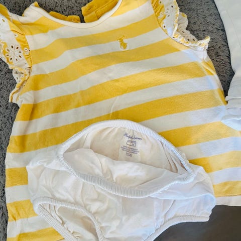Polo Ralph Lauren romper for baby jente i størrelse 62. Plagget er ermeløst og har rosa og hvite striper. Overdelen har volangdetaljer ved halsen og liten logo på brystet. Romperen har knepping bak og nederst for enkel av- og påkledning, samt strikk nederst ved bena for god passform. Laget i bomull, som gir et mykt og behagelig materiale mot huden. Passer til hverdagsbruk og ulike anledninger.