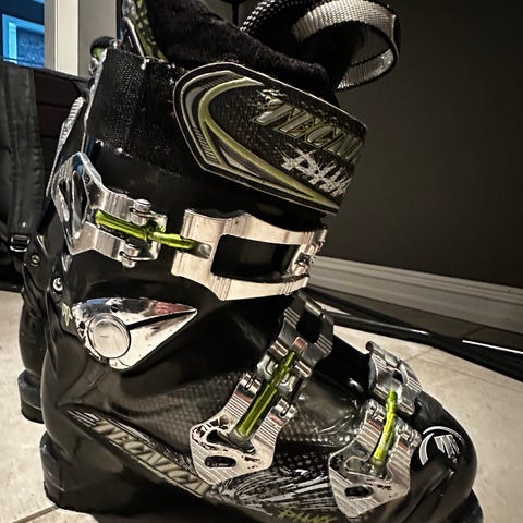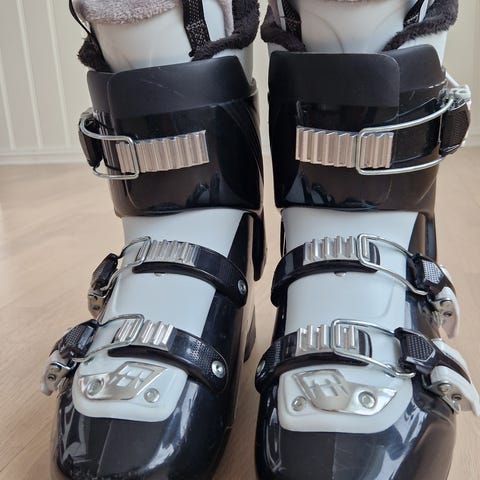 Tecnica JT 2 alpinstøvler i størrelse 235 mm. Støvlene er i hovedsak svarte med hvite og røde detaljer. Modellen har to spenner foran for enkel justering og god støtte rundt fot og ankel. Sålen er merket ISO 195 og 235 mm. Egner seg som alpinstøvler til barn med passform til fotlengde rundt 235 mm. Materiale i hard plast med polstret innersko for komfort og stabilitet i bakken.