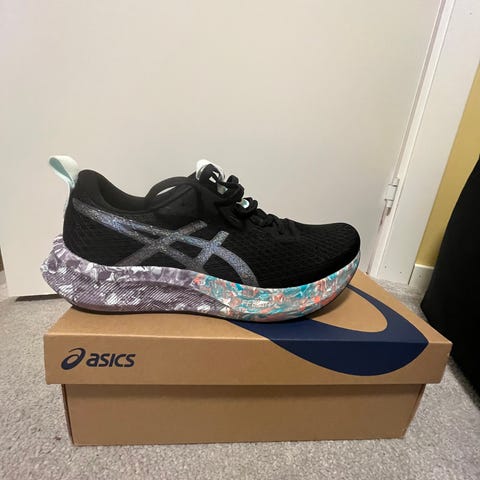 Asics Noosa Tri løpesko i størrelse 44. Løpeskoene har et flerfarget mønster i hovedsak med oransje, grønne og gule toner, med sort innside. Modellen er laget for løping og har pustende overdel og såle med mønster for godt grep. Passer til løping og trening på vei eller tredemølle.