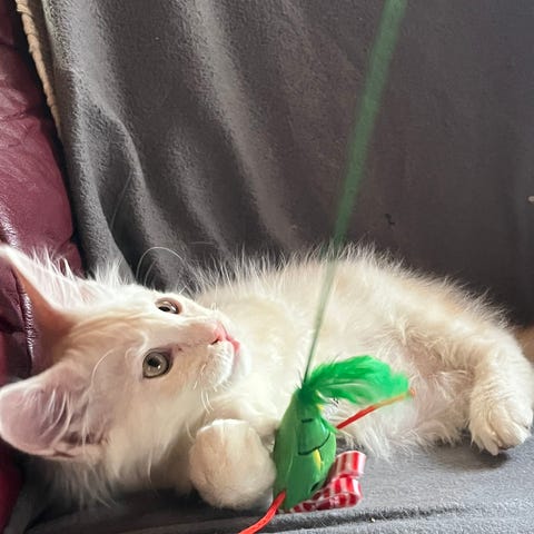 Han får med seg en kattungepakke ifra musti med tørrfôr, godbiter, gavekort og rabattkuponger.